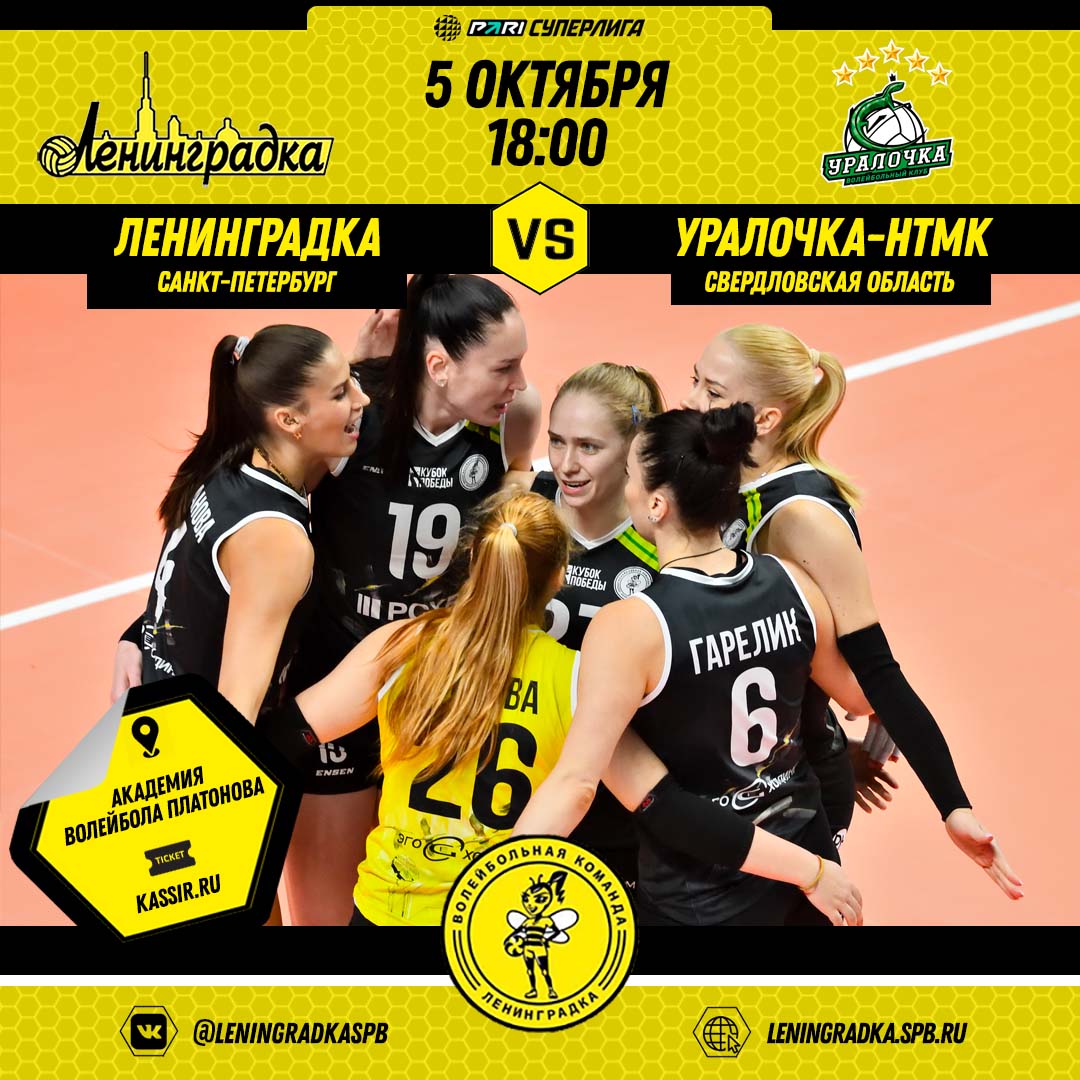 5 октября «Ленинградка» проведёт матч 1-го тура чемпионата женской Суперлиги. В 18:00 наши девушки дома сыграют с командой «Уралочка-НТМК». Встреча пройдет в Академии волейбола Платонова. Ждём наших болельщиков на трибунах!