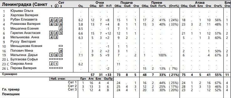 Самым результативным игроком в составе «Ленинградки» стала Анастасия Гарелик, заработавшая 15 очков. Валерия Романова набрала 13 очков, Елизавета Рубан — 12. У «Енисея» по 9 очков себе в актив записали Валерия Борисова и Елизавета Салтыкова.