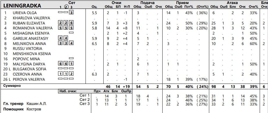 Самым результативным игроком в составе «Ленинградки» стала Валерия Романова, заработавшая 14 очков. Анастасия Гарелик набрала 9 очков. У «Тулицы» 16 очков себе в актив записала Александра Мамедова.